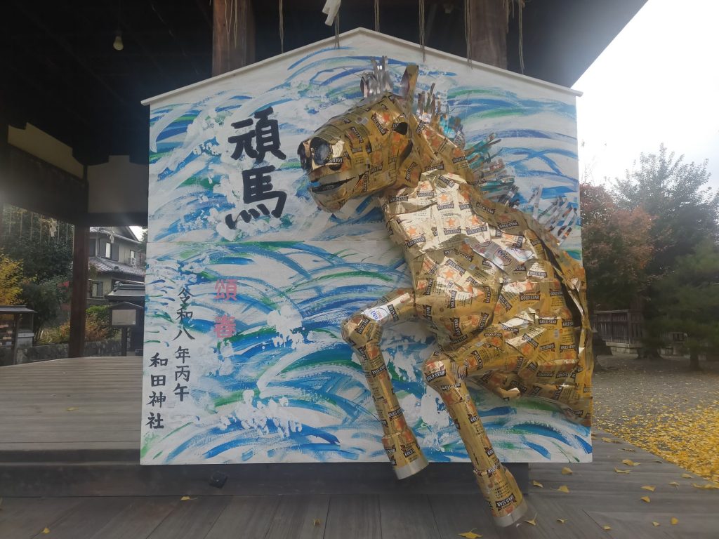 社(?)には来年の干支の馬の飾り物が展示されていました。なんと素材がビールの空き缶でなんともびっくり。近所の学生さんが製作されたのでしょうか。サッポロのゴールドスターのみかと思いきや、さりげなくオリオンビールの缶もちらほら。