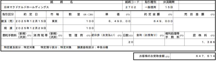 - 日本マクドナルドホールディングス(2702)貸株料20日分 1386円