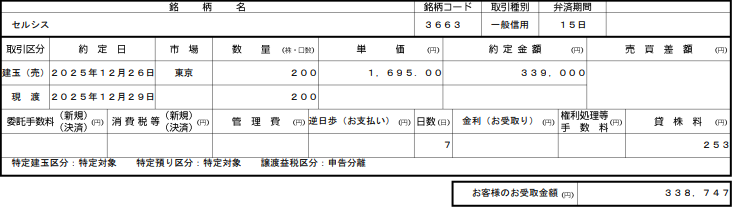 - セルシス(3663)貸株料7日分 253円