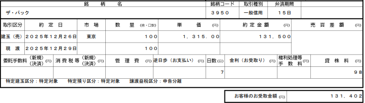 - ザ・パック(3950)貸株料7日分 98円
