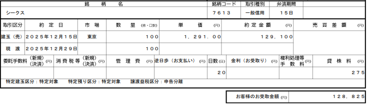 - シークス(7613)貸株料7日分 275円