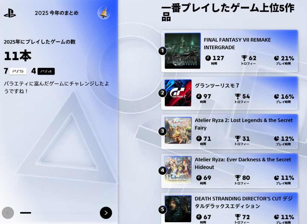 プレイした本数が11本となってますが、PS5を買い替える前のグランツーリスモ7とかPS5アップデート対応のライザのアトリエ2など重複しているタイトルがあるので実際に新しく遊んだのは6本くらいだと思います。