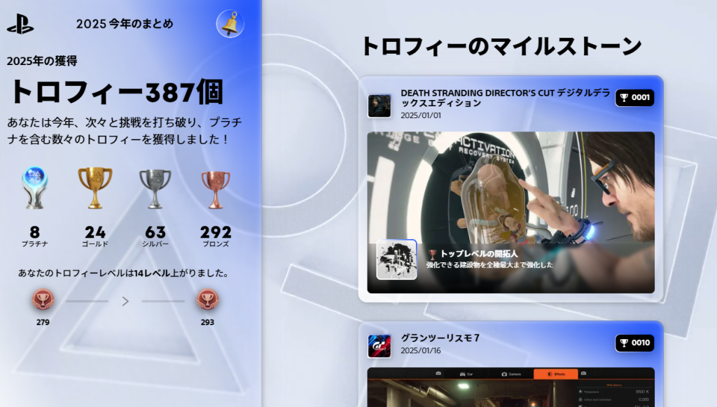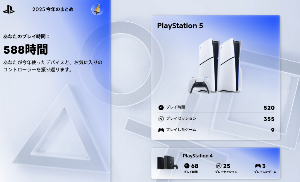 毎年PlayStationから一年でどのくらいゲームをプレイしたかの一覧を見れるものが配信されるはずが、メールを見落としていたようでログインしてみたら見ることができました。