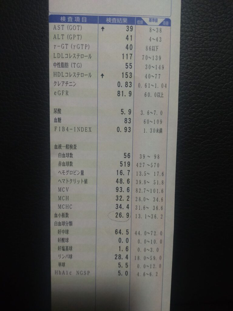 今回は有料で肝臓の繊維化が進行しているかの検査としてFIB4-INDEXという項目も見てもらいましたが、基準値1.30未満のところ0.93と問題のない数値で安心しました。