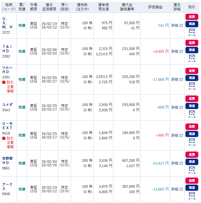 クロス取引した銘柄は以上の画像のように7銘柄となりました。いつものようにSBI証券の一般信用売枠でクロスしました。