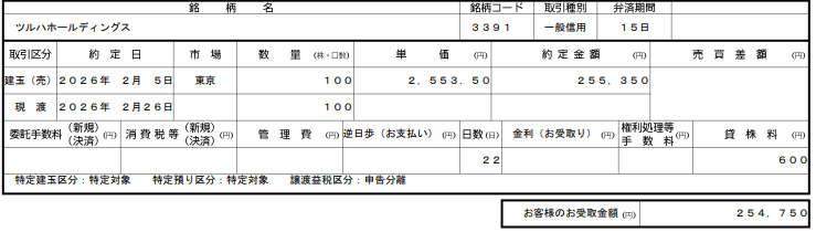 取得費用に関しては信用取引報告書から以上の通りとなりました。合計取得費用は3305円となりました。