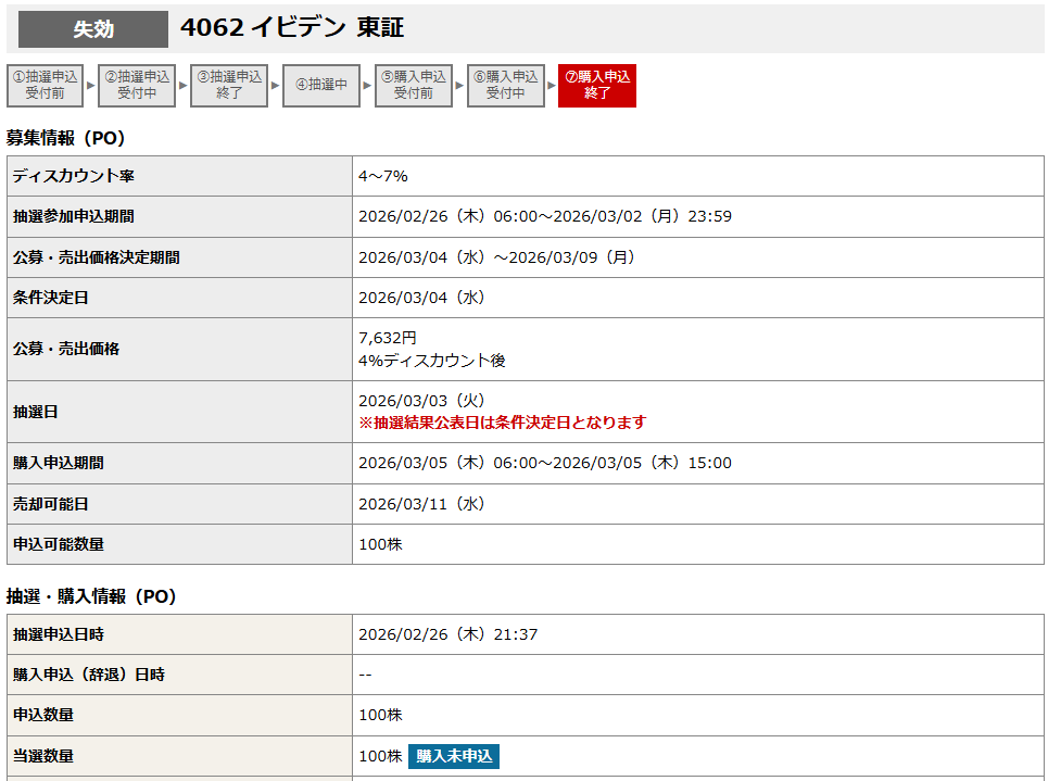 野村証券が主幹事のイビデンという銘柄も申込をしていたのですが、こちらは失効となっていたので当選していたのに申込に間に合わずに失効してしまっていたようです。購入未申込となってますね。抽選日の翌日15時くらいまでとIPOと比べて申込期間が短いのが痛いですね。